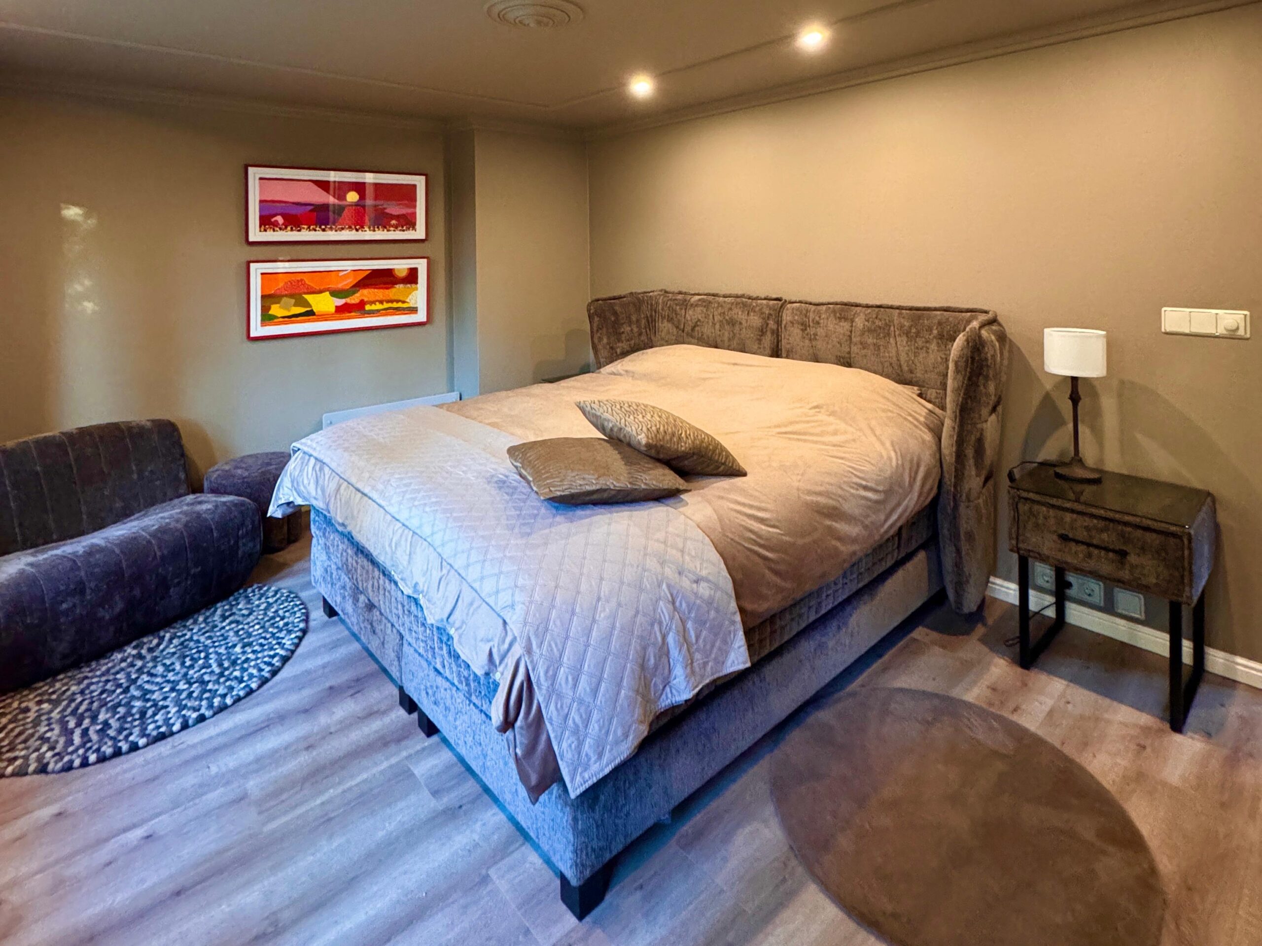 De slaapkamer biedt een heerlijk ruime en comfortabele sfeer. Vanuit het bed heb je een prachtig uitzicht op de tuin, waar je